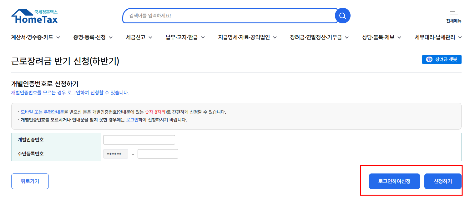 - "근로장려금 신청" 메뉴에서 본인 인증 후 신청